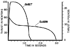 So their potential power is indicated by a letter. However a motor of any given energy range might be configured to deliver only the middle of energy range rather than the full amount. That's because you don't always want the full amount. The motor manufacturer's charts give you this information. The letter is followed by a number. The number tells you what the average thrust is. An example would be an I-170 or an I-240. We’re used to speaking in terms of horsepower and such, however, that’s only part of the equation, the amount of time you apply a given amount of horsepower is needed to figure the total energy used. In rocketry we use a different measurement and it’s related to the total energy of the motor, i.e., power and time. Rocket motors are rated in Newton-seconds, however if you divide it by 4.45 and you'll get pound-seconds. In other words so many pounds of force for one full second. I don't want to lose you here so let me give you a little comparison that makes it simple to understand. Think of the term "Newton-seconds" (or pound-seconds) as a way to express the amount of energy in four ounces of gasoline. One ounce of gasoline has 50.7 Newton-seconds of energy so four ounces of gasoline has 202.8 Newton-seconds (or 45.6 pound - seconds) of energy. With it, you can propel a car very fast for a brief time or slow for a long time. Either way you'll burn up four ounces of gasoline and consume the same amount of energy (202.8 Newton-seconds or 45.6 pound - seconds). The choice is in how to use the energy, fast and brief or slow and long.
