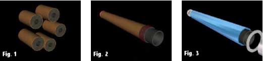 Figure 1: These are APCP propellant slugs (called grains). They are cast in dense cardboard or phenolic liners. The propellant grains are installed in "sections" so the ends will burn as well. This keeps the burn surface area and thrust relatively consistent. Figure 2: A protective liner has been slid over the stacked propellant grains. This is to protect the aluminum motor case from the heat during the burn time. The liner is fitted with the nozzle and its O-rings that seal the gasses so they can't escape around the nozzle. A sealing cap is fitted at the head end on this motor. Figure 3: The propellant, liner, and nozzle are installed and the "end closures" are ready to be installed.