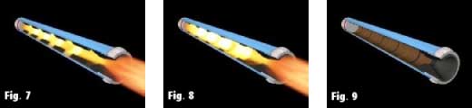 Figure 7: Here's a perfect illustration of the burning process in a motor. See the burning grains of propellant? The grains burn both at the core area and the ends. This way the burning surface area doesn't keep increasing. Figure 8: The motor is still burning fiercely but you can see the APCP fuel grains are getting small. Figure 9: The propellant grains are nearly gone and the motor exhausted. This does not mean that the rocket has stopped. In fact, the rocket is traveling at it highest velocity at motor burn-out and continues to climb (coast) for a considerable length of time. It’s always easy to find a rocketeer to help you assemble your first couple of motors. Physical size Motors also come in standard diameters. I’ll list them and the powers usually found in that size but know that they overlap somewhat. This allows for versatility in rocket design. Each diameter also comes in different lengths to make the different powers possible.